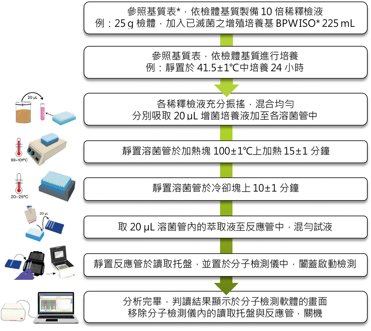 - 本表參照3M™ 病原菌分子檢測 ─ 大腸桿菌O157(含H7)套組AOAC-OMA 2017.01官方方法編譯。